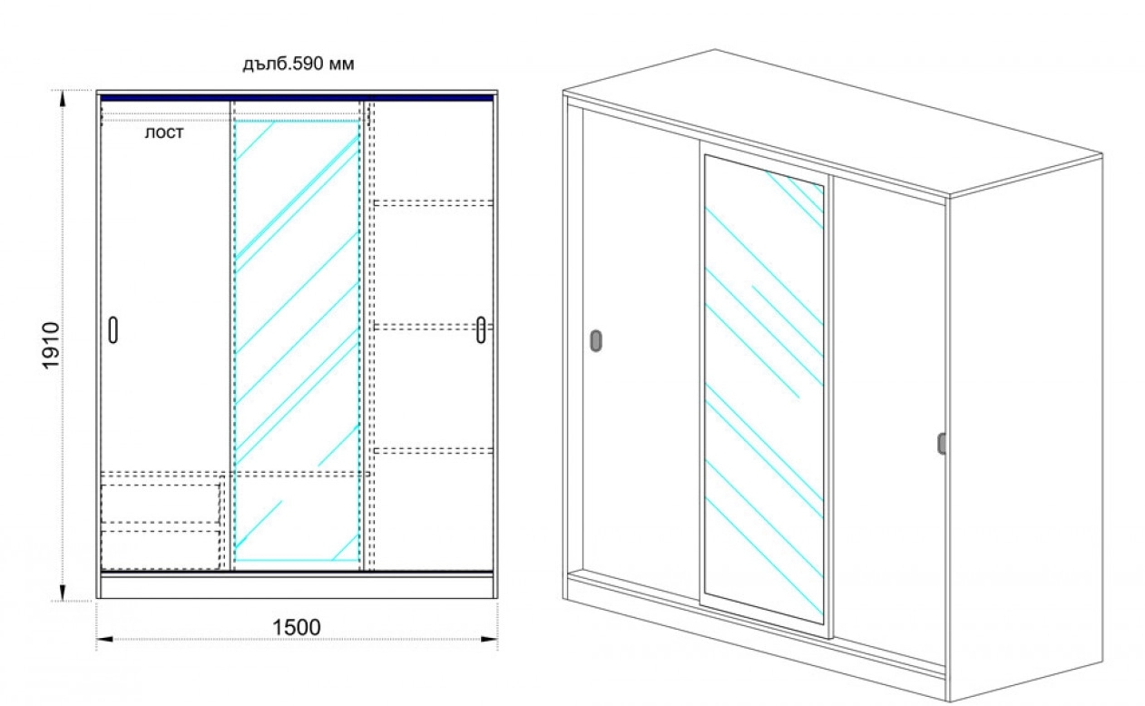 - Трикрилен гардероб с лост,рафтове и 2 вътрешни чекмеджета