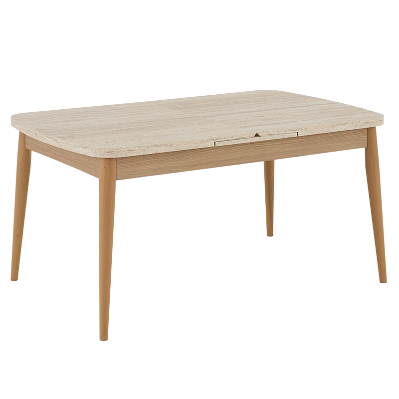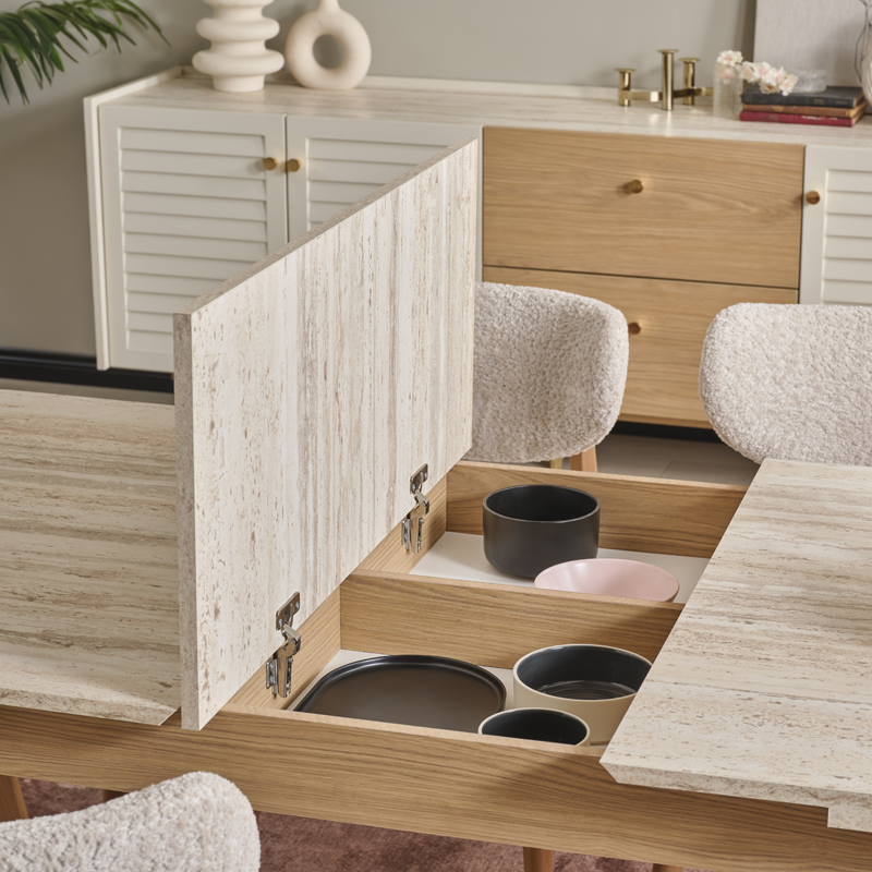 Моделът разполага с лесен механизъм за разтягане, като средният плот е на панти и разкрива две удобни отделения за съхранение на прибори и други трапезни принадлежности.