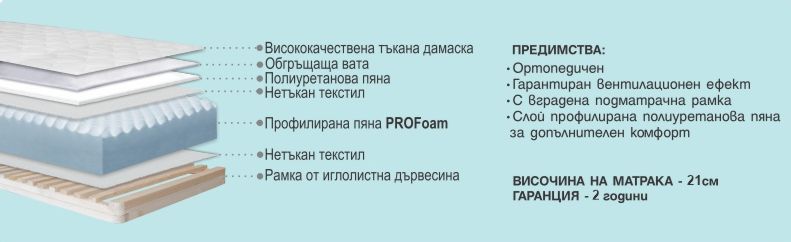 Матрак Тея е ортопедичен модел, създаден за комфортен и здравословен сън. Ядрото от профилирана PROFoam пяна и 5 зони на комфорт осигуряват правилна опора на тялото и равномерно разпределение на тежестта. Вградената подматрачна рамка от иглолистна дървесина придава допълнителна стабилност и дълготрайност.Моделът е без пружини, безшумен, антиалергичен и осигурява добра вентилация по време на сън. Висококачественият дамаск и допълнителните слоеве пяна създават приятно усещане за мекота и комфорт.