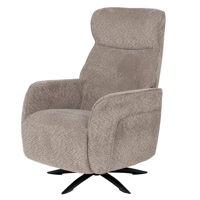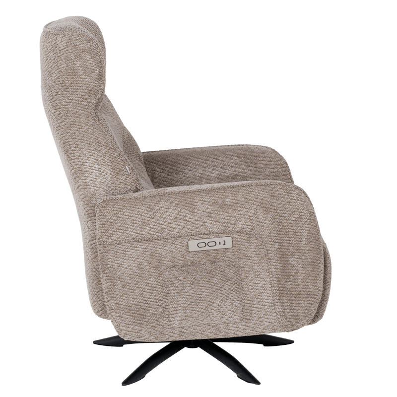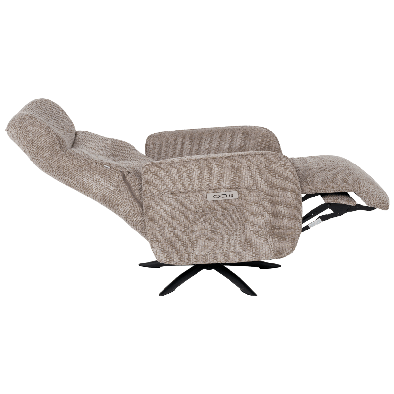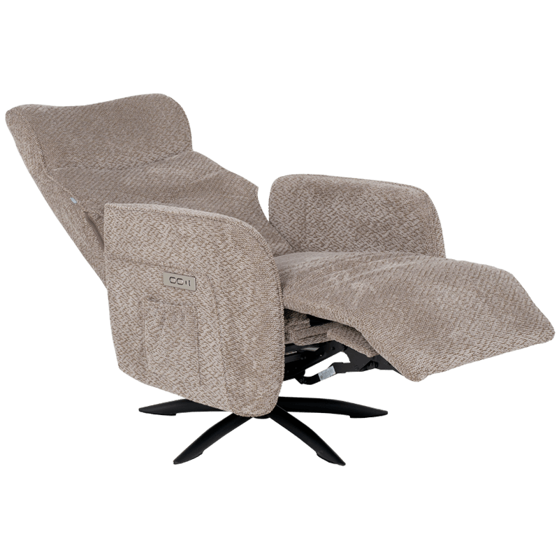 • Моделът се отличава с елегантна тапицерия от мека текстилна материя в неутрален кафяв цвят, която лесно се вписва в различен тип интериор. Креслото е снабдено с многофункционален електрически механизъм за разтягане, позволяващ плавно регулиране на позицията на облегалката и поставката за крака