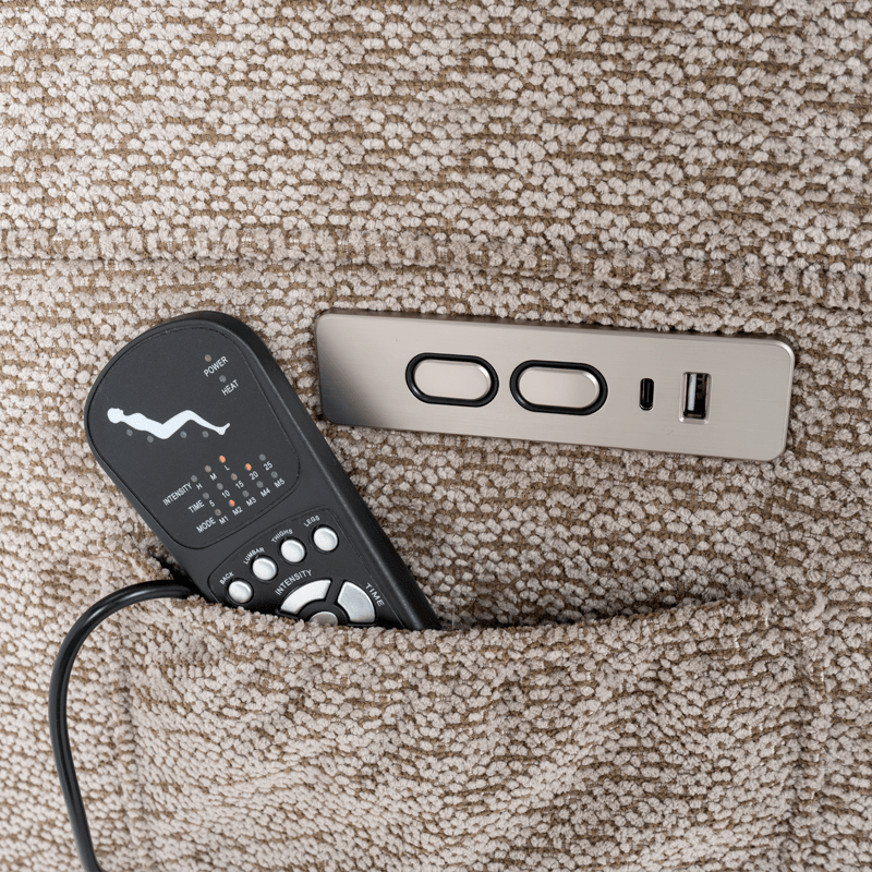 • Допълнително удобство осигуряват вградените USB и Type-C портове за зареждане на мобилни устройства, разположени в страничния панел, както и практичният страничен джоб за дистанционното управление.