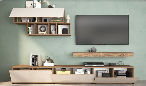• Моделът разполага с удобни шкафове с клапващи врати, горен модул с повдигащ механизъм и отворени ниши за декорация.
