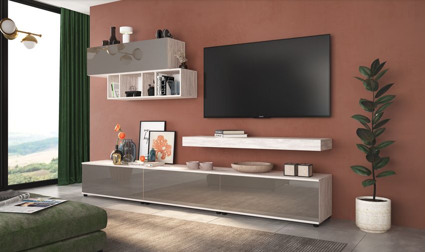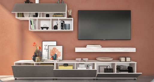 - Моделът разполага с удобни шкафове с клапващи врати, горен модул с повдигащ механизъм и отворени ниши за декорация.